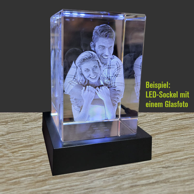 Ein Glasblock mit Laserinnengravur ist ein tolles Medium um ein Foto besonders ausgefallen zu präsentieren. Mit einem passenden Leuchtsockel, der das Bild von unten anstrahlt, wird der Effekt noch verstärkt. Dies ist besonders hilfreich um einen Glasblock auch in einem etwas dunkleren Ort im Regal auffallend zu gestalten.